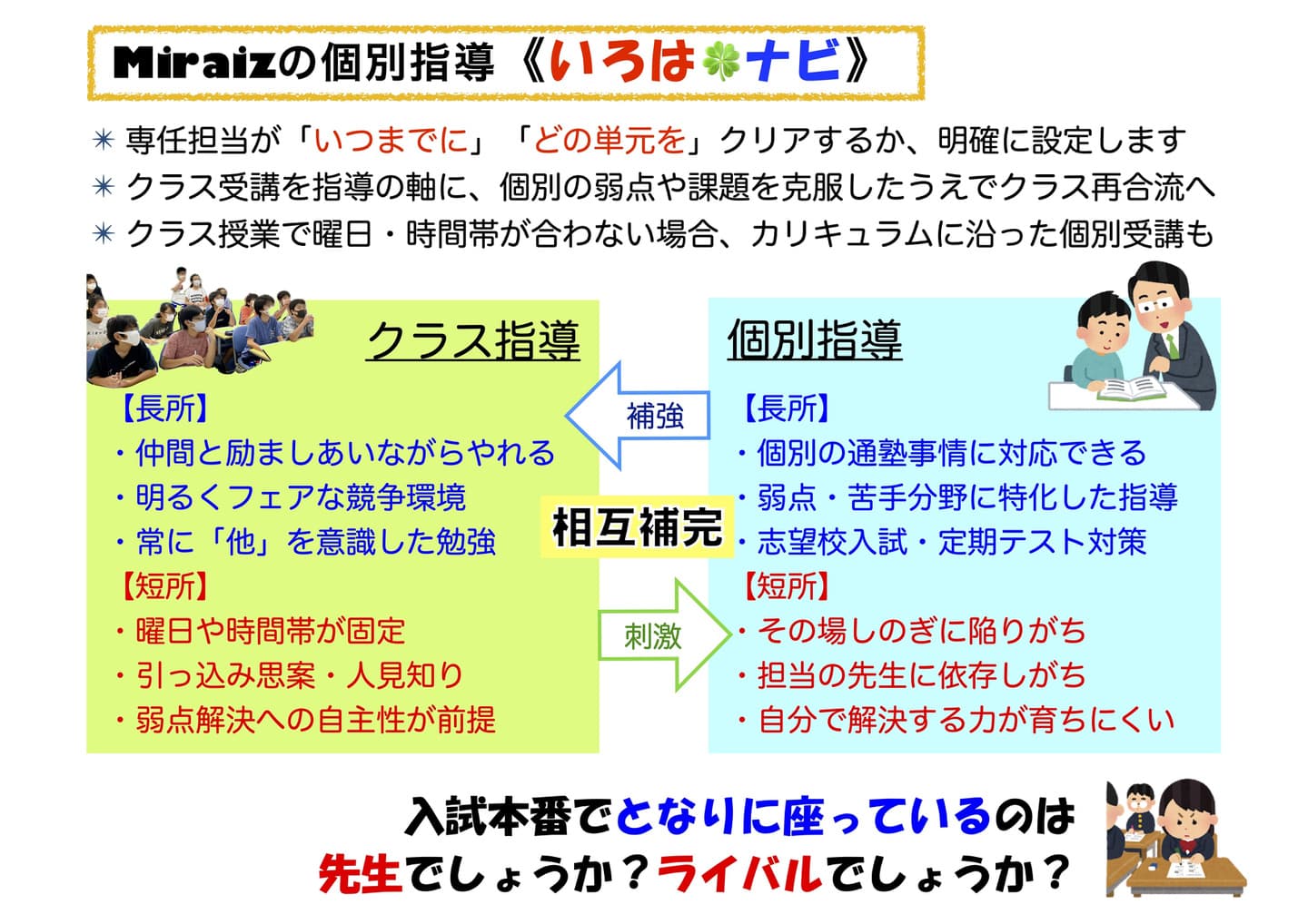 クラス指導が中心ですが、ご要望に応じて「いつまでに」「何をできるようにするか」を明確にした、短期的な個別指導コース《いろはナビ》をご用意しています。高校生や中学受験生の指導も可能です。
