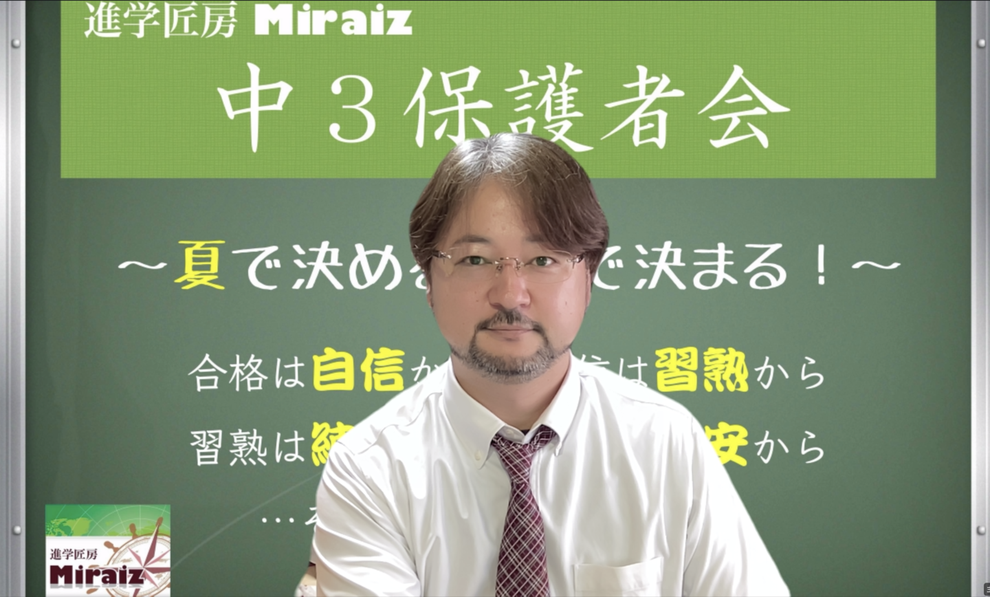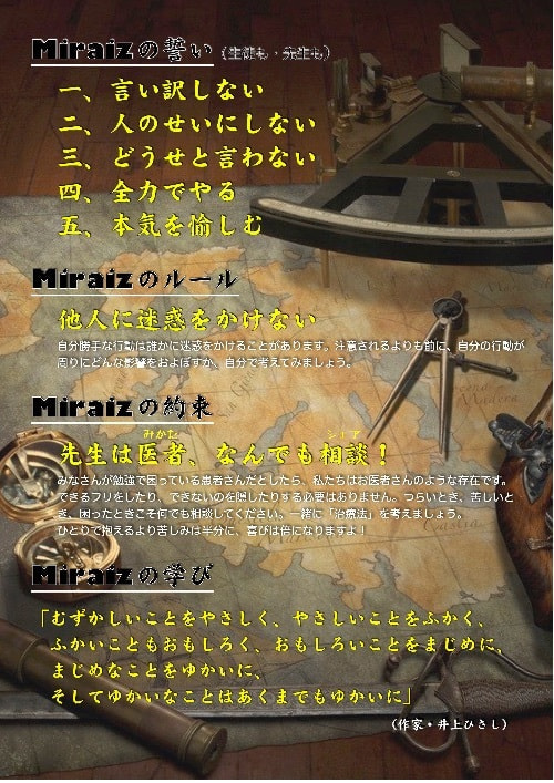 なお、生徒の居残り学習などは、最終で午後10時までとしています。塾からの帰宅が不自然に遅い場合には、すぐにご連絡ください。また、近隣の方にご迷惑をおかけしないよう、自転車の駐め方と夜間の大声やおしゃべりに気をつけてください。教室の外に一歩出たら「会話はすべて無声音!」が Miraizマナーです。