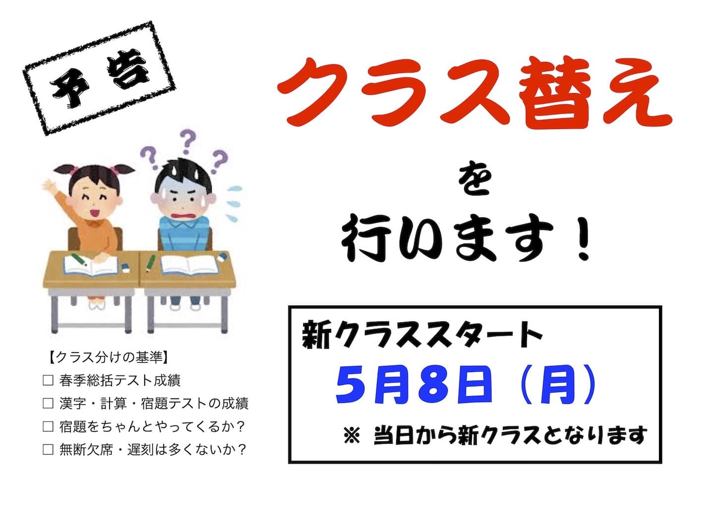 習熟度に応じた適切な指導のため、定期的に各学年でテスト成績(期末総括テスト・M-1GP・宿題テスト)をもとに進度別のクラス編成を行います。