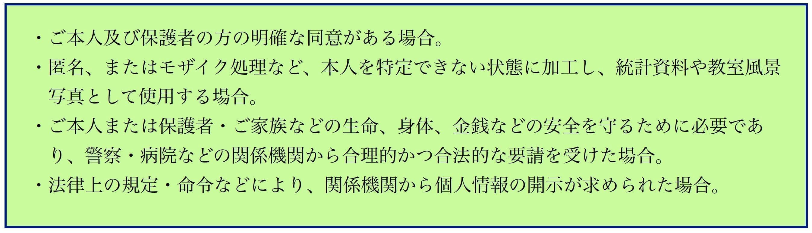 個人情報の取得については、業務上必要不可欠な範囲にとどめ、合法かつ公正な方法でのみこれを行います。また、法令その他の規定にかかわらず、生徒・保護者の方が不快に思われるような方法での情報取得及び利用は一切行わないことをお約束いたします。