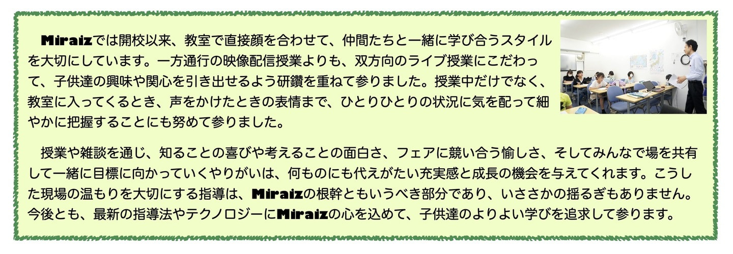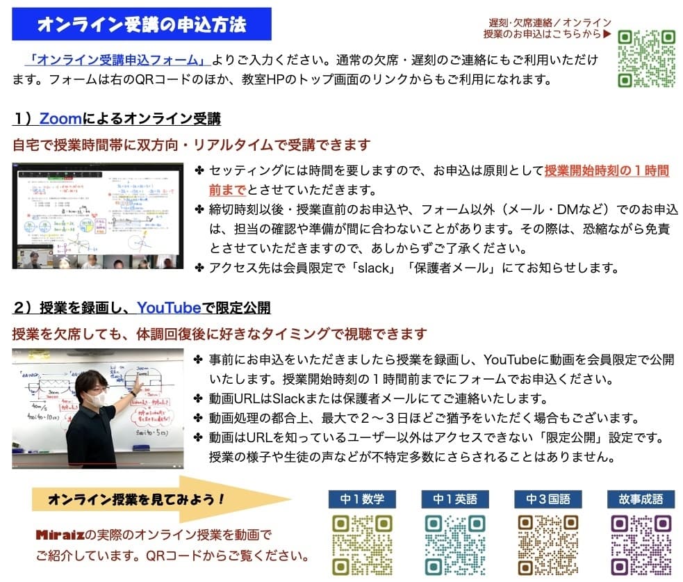 Miraizでは "Zoom" を用いたオンライン授業・授業録画を随時ご用意しています。体調不良や用欠時、悪天候などで安全な通塾が難しい場合などにぜひご利用ください。