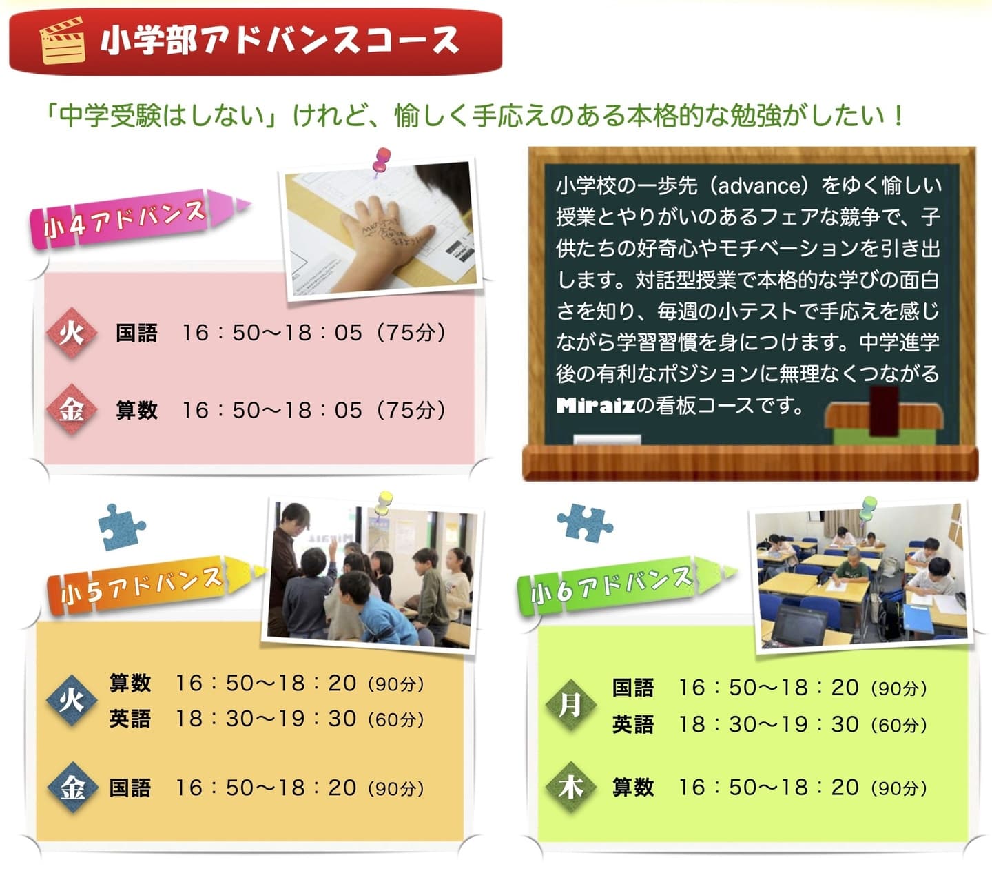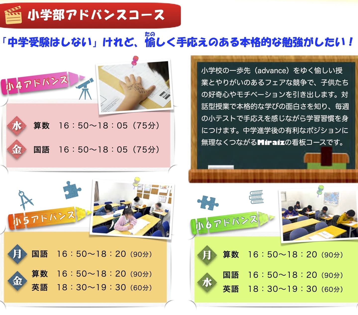 アドバンスコースでは、中学受験に見られるような、極端な先取り学習や無理なツメコミとは一線を画し、その学年で習う内容の定着を大切にしています。中学校につながる基礎・基本の習熟に重点を置いたMiraiz独自のカリキュラムで、学校の「一歩先(advance)」を進みます。