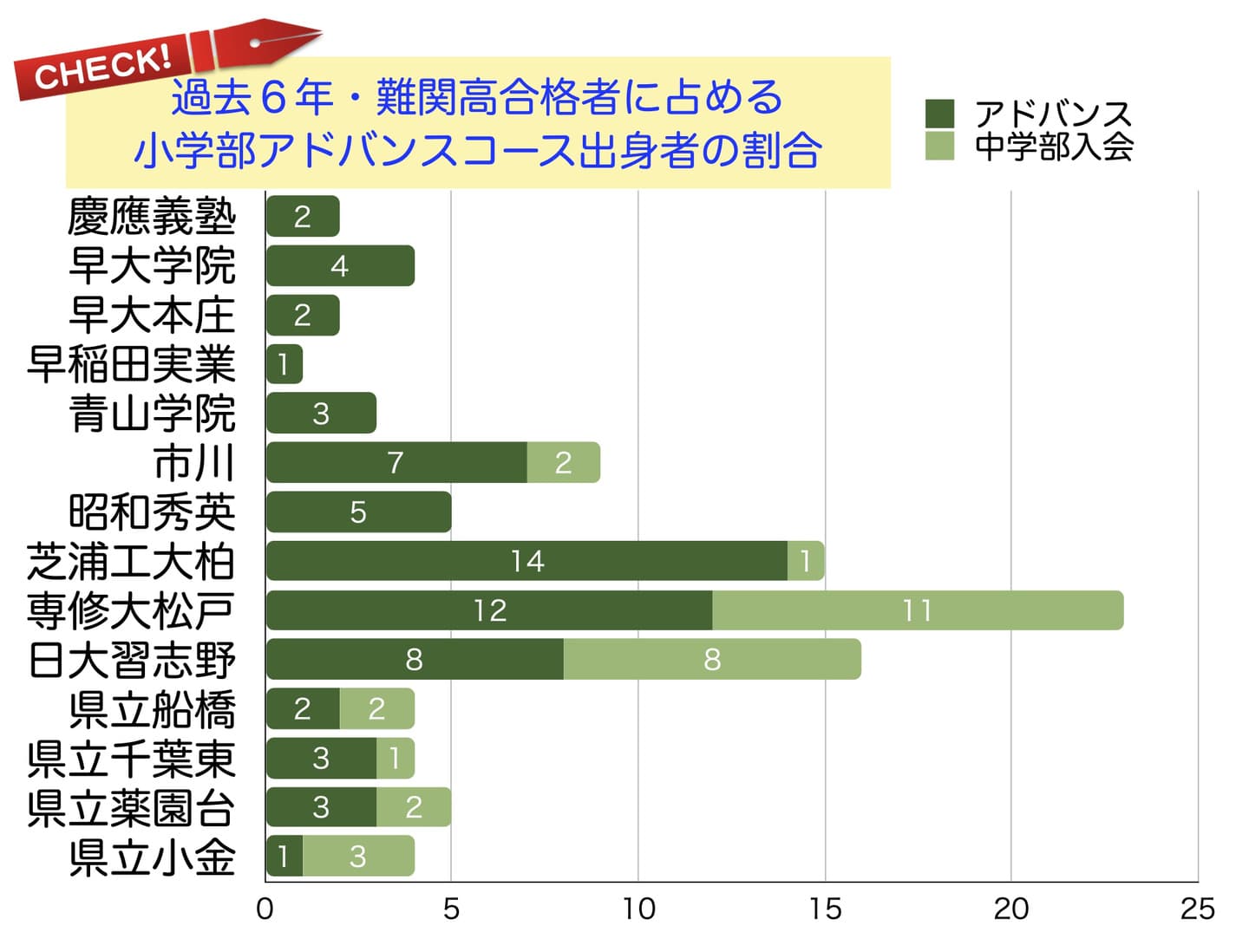 右の表はその例として、2019年春〜2024年春までの難関高合格実績のうち、小学部アドバンスコースからお通いいただいた生徒の皆さんの割合を示しています。