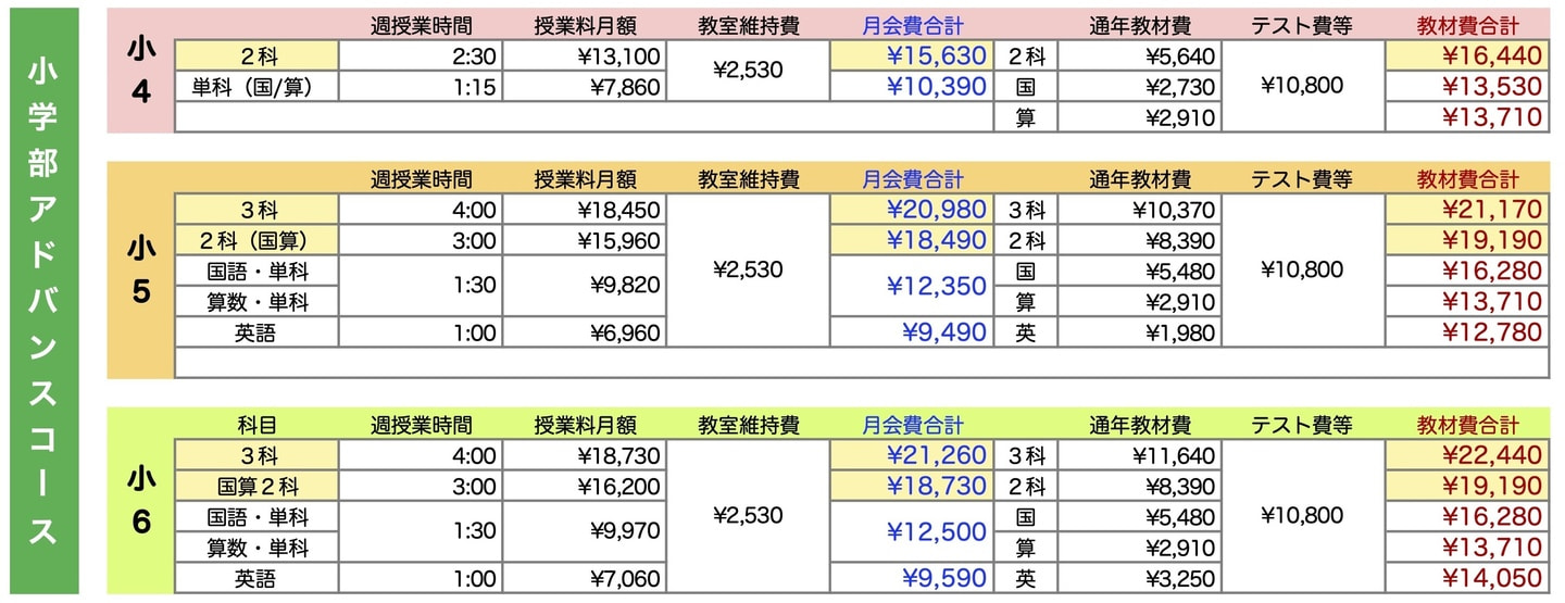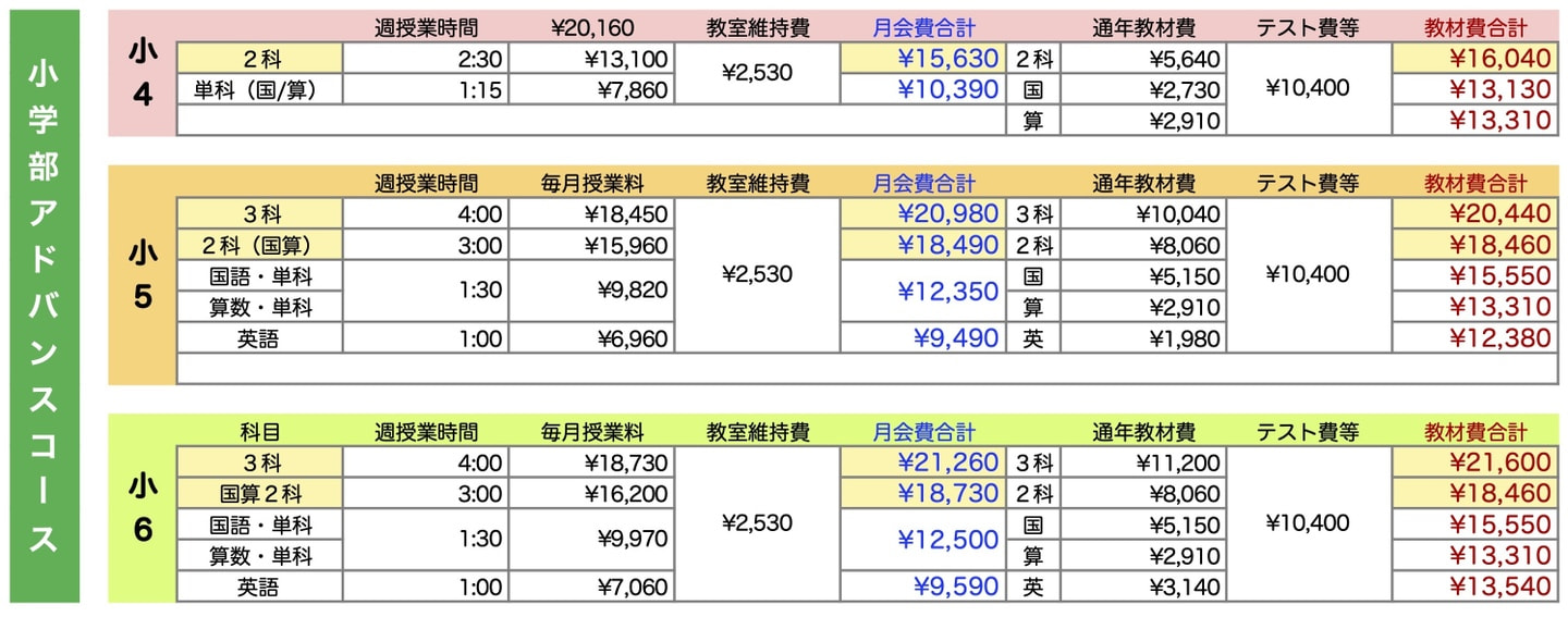 - [教室維持費] 教室管理維持費、通信費、冷暖房費、施設費、清掃費、また万一の事故に備えた「学習塾総合保険」の加入費などの一部として、全学年とも ¥2,530(税込)/月 をお納めいただきます。