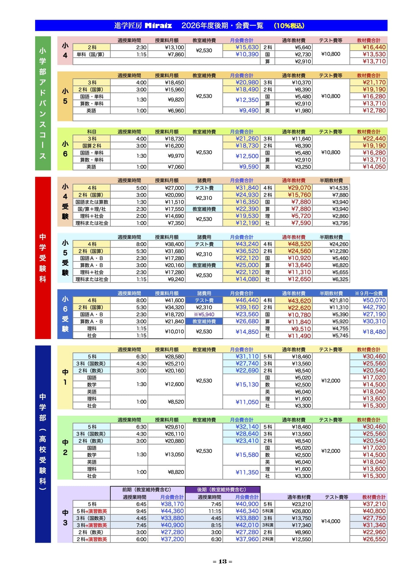 - 全学年 ¥11,000(税込)です。入会お申込時に受付にてお納めください。
