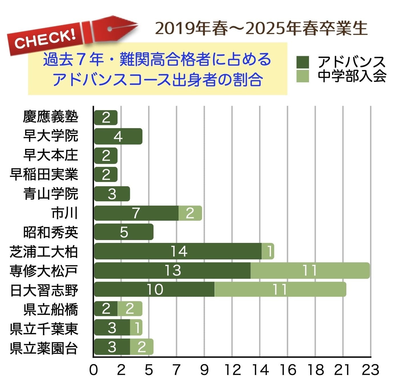 右の表はその例として、2019年春〜2025年春までの難関高合格実績のうち、小学部アドバンスコースからお通いいただいた生徒の皆さんの割合を示しています。
